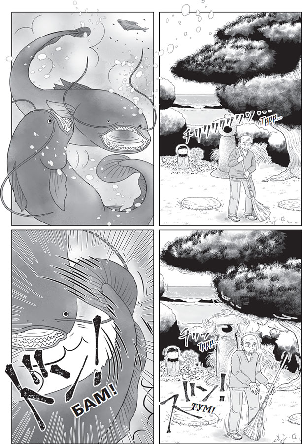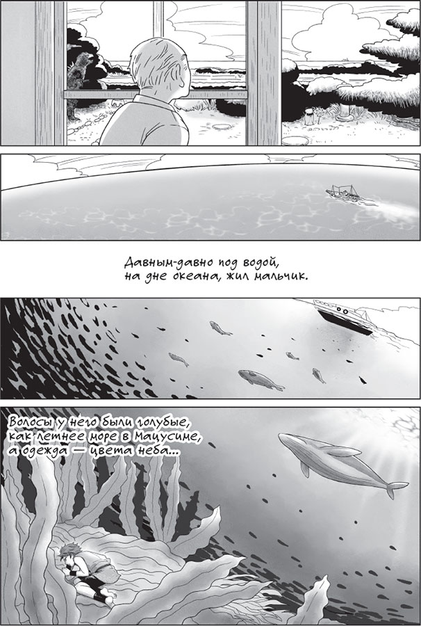 И на каждом листе появляется простой, но уверенно нарисованный герой – мальчик с ярко-голубыми волнистыми волосами: вот он бежит по крыше храма, ныряет сквозь стайки рыб к затонувшему кораблю, лавирует в клубке из запутанных японских иероглифов, надписей – звуковых эффектов и полуграмотных фраз на английском.