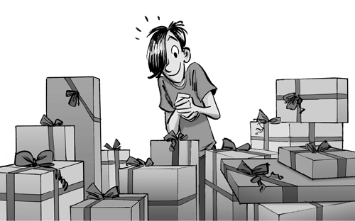 Покончив с едой, он взял стакан с газировкой и обвёл комнату зачарованным взглядом. На полу стояли ряды пакетов и коробок самых разных расцветок и размеров. Накануне вечером юноша только и делал, что отворял двери курьерам из служб доставки, которые приносили один подарок за другим. Позолоченная бумага поблёскивала в слабом свете, который просачивался сквозь жалюзи в домик на кровле Бейкер-Палас.