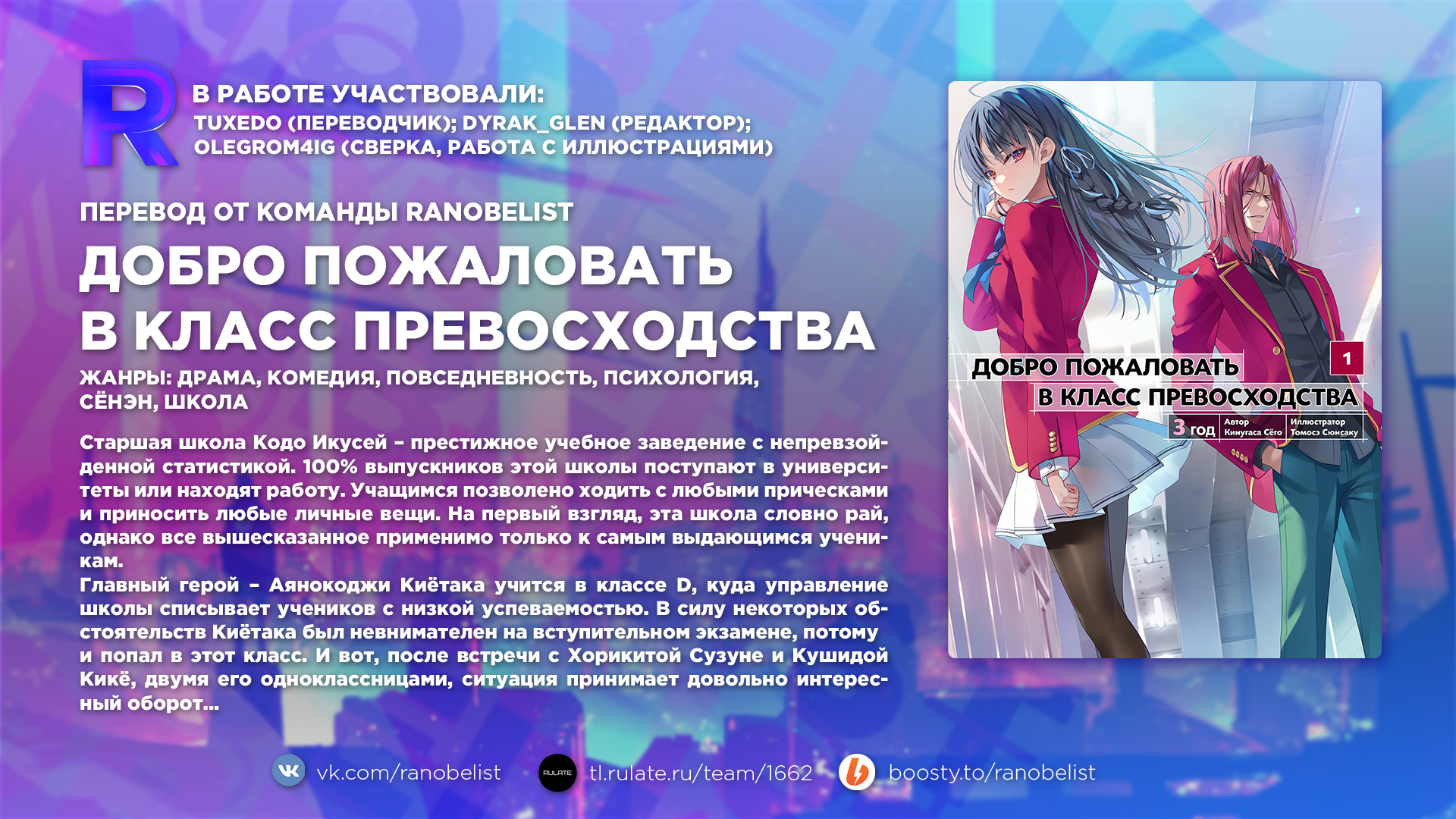 История наконец-то подошла к последнему для учащихся старшей школы году. В книге прошло всего два года, а в нашем реальном мире мы вот-вот преодолеем важную отметку в десять лет. Такое ощущение, что мы с вами, дорогие читатели, повзрослели вместе. Я думаю, третий год по объему будет примерно таким же, как и первый или второй год, однако попрошу вас не воспринимать эти слова за истину в последней инстанции.