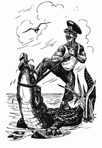 А Краснобаев не стал времени зря терять, схватил свой широкий офицерский ремень, бросился чудовищу на спину, поднял ему морду и мигом скрутил пасть. Да так крепко, что у крокодила слезы его крокодиловы так и брызнули фонтаном. Смотрит он на Краснобаева и плачет, а на носу у него пряжка от краснобаевского ремня светится. И серп и молот на ней огнем горят.