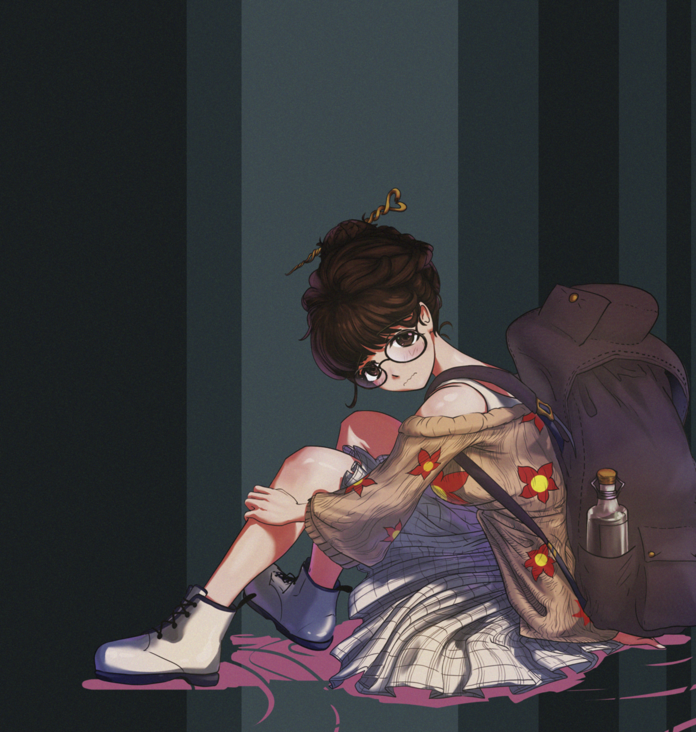 Распущенные черные волосы были завязаны в шиньон, обнажающий затылок, а темные и блестящие глаза смотрели по сторонам, как бы не в силах скрыть свою тревогу. Она носила простую клетчатую юбку, шубу с деревенским цветочным узором и белые сапоги.