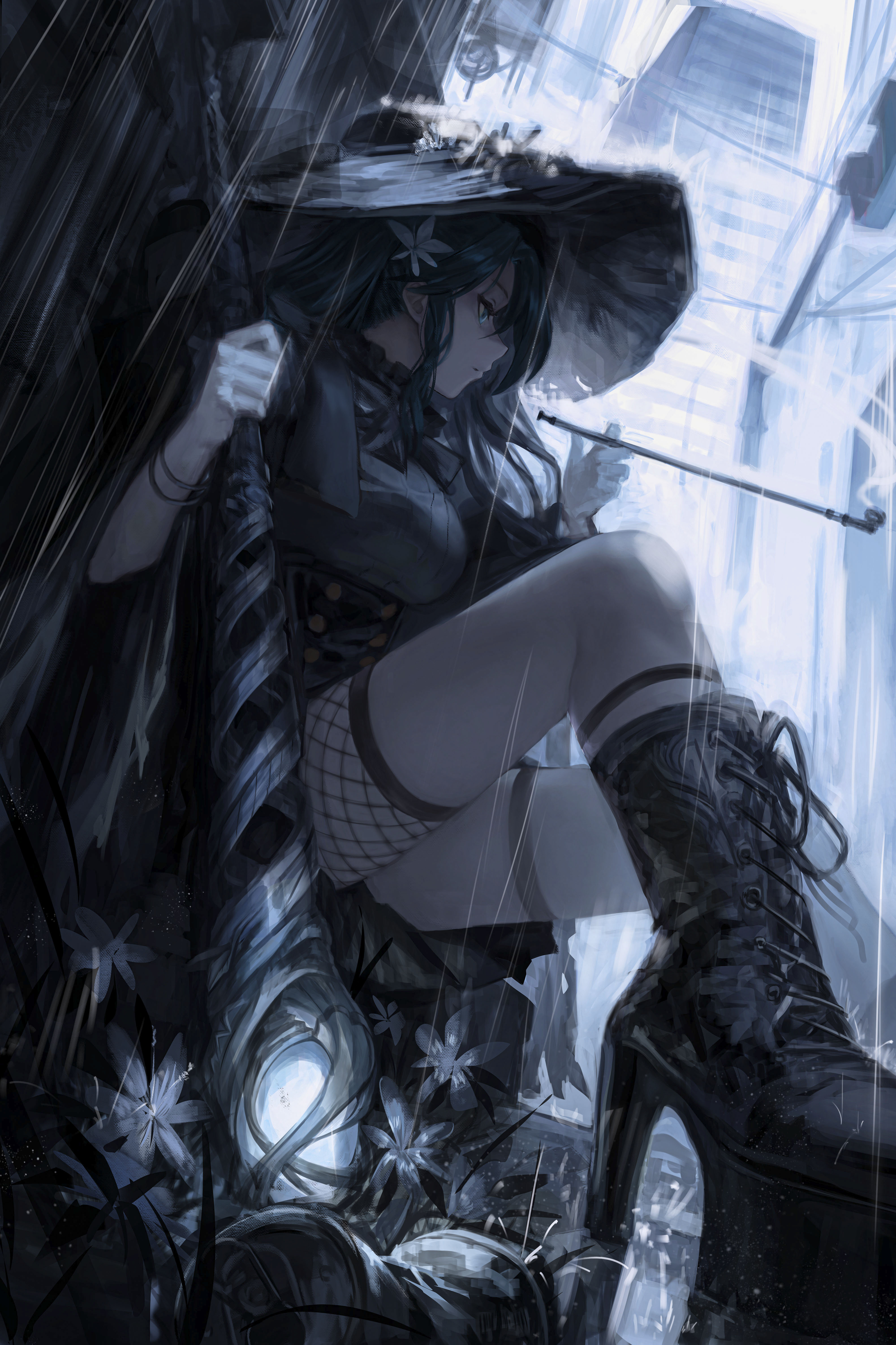 Видя, как капли дождя падают на ее остроконечную шляпу, в сочетании со стилем ее одежды европейской ведьмы, зрелище выглядело довольно впечатляюще. На конце ее посоха, украшенного цветами, сиял окутанный маной зеленый сапфир. На плечах была накинута мантия, а снизу - черная юбка, которая закрывала только некоторые части ее бедер.