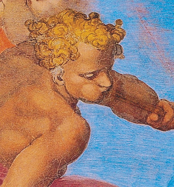 Фигуры в нижней части картины – наиболее завершенные. Трубящие ангелы прописаны так же тщательно, как в станковой живописи, на кратчайшем расстоянии от глаза. Представителям школы Рафаэля особенно нравился ангел, помещенный в центре, с протянутой левой рукой. Он весь словно надулся. Оценено было и преодоление трудностей в изображении Адама, который, несмотря на рельефные мускулы красивой формы, обнаруживает достигнутую первым человеком глубокую старость. Кожа спадает с него.