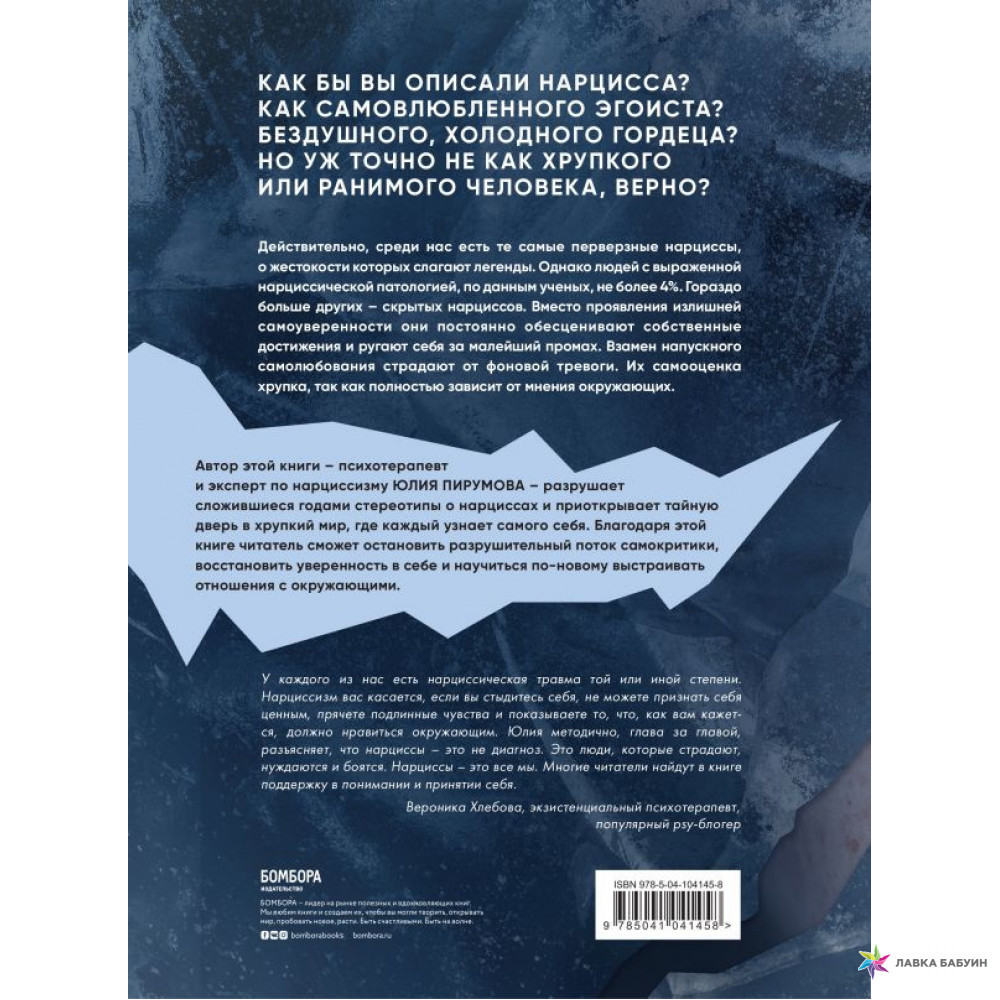 "У каждого из нас есть нарциссическая травма той или иной степени. Нарциссизм вас касается, если вы стыдитесь себя, не можете признать себя ценным, прячете подлинные чувства и показываете то, что, как вам кажется, должно понравиться окружающим. Юлия методично, глава за главой, разъясняет, что нарциссы – это не диагнозы. Это люди, которые страдают, нуждаются и боятся. Нарциссы – это все мы. Многие читатели найдут в книге поддержку в понимании и принятии себя", – Вероника Хлебова, экзистенциальный психотерапевт, популярный psy-блогер.