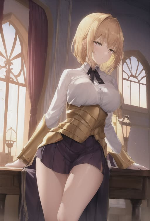 Женщина с короткими золотистыми волосами, которые сияли ещё ярче, чем великолепная красота доспеха. Её спокойное лицо было наполнено молчаливым недовольством, несмотря на всю её красоту.