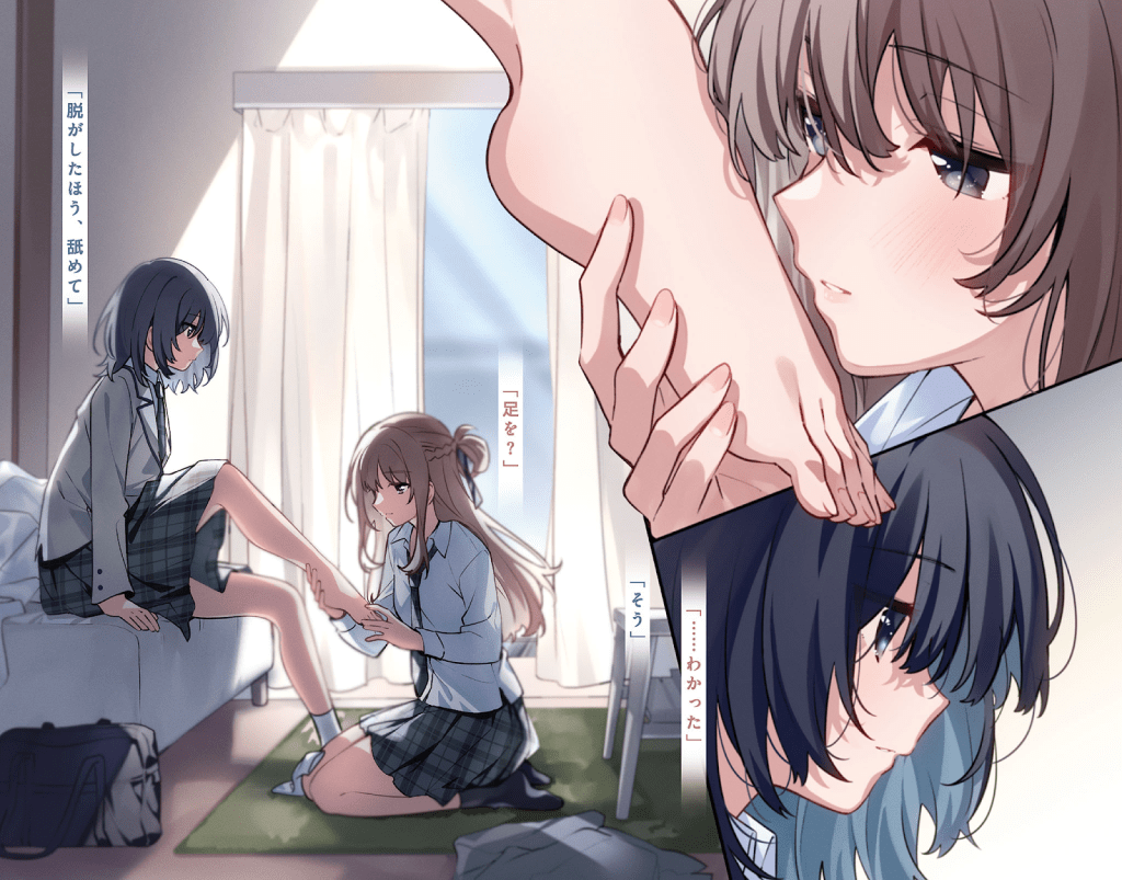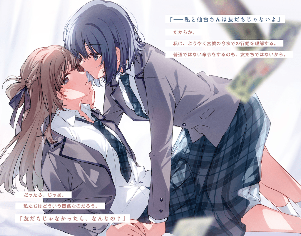 Эта девушка Мияги — странная. Раз в неделю за пять тысяч иен она покупает право мне приказывать. Мы вместе играем в игры, она заставляет меня кормить её сладостями, а порой, поддавшись настроению, отдаёт и опасные приказы. Прошло уже полгода с тех пор, как у нас появилась общая тайна, но она твердит: