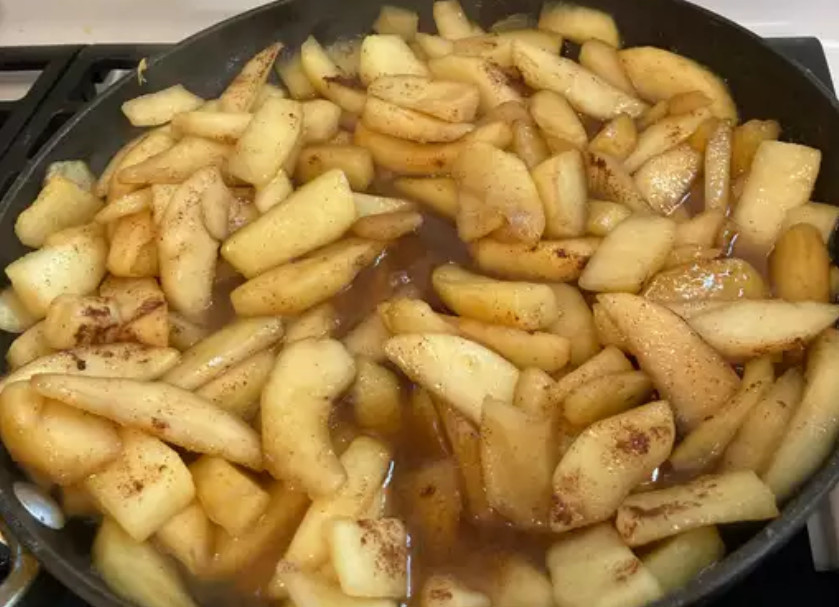 Когда масло зашипело, он быстро достал из рюкзака несколько яблок, мелко нарезал их и добавил в сковороду, посыпав солью и обжарив.
