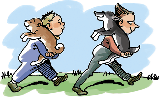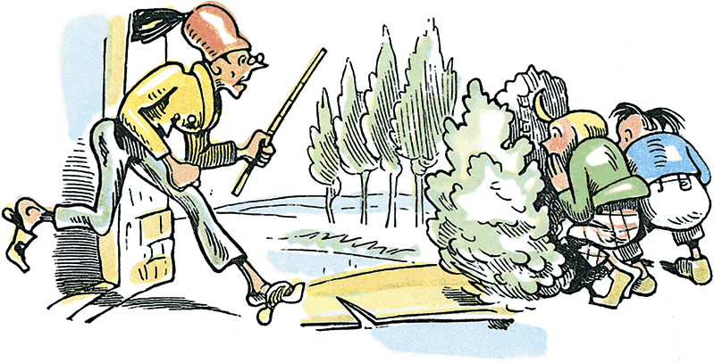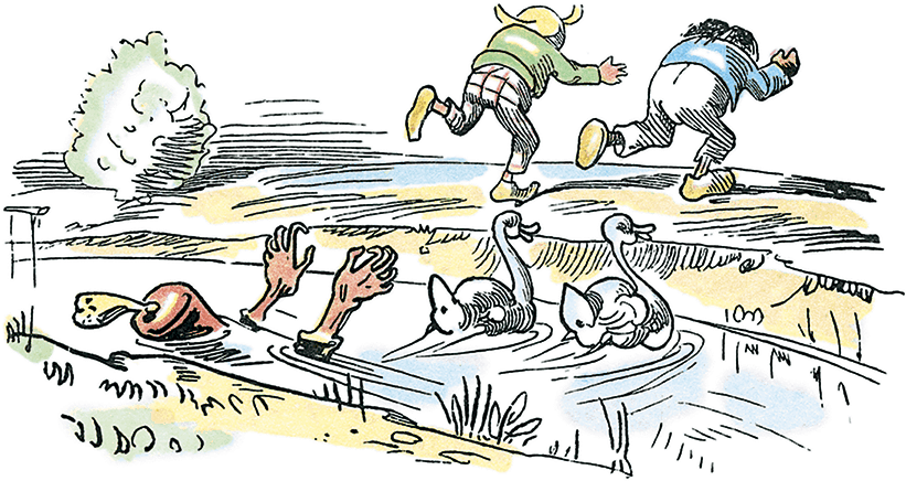Плих и Плюх несутся к пруду.