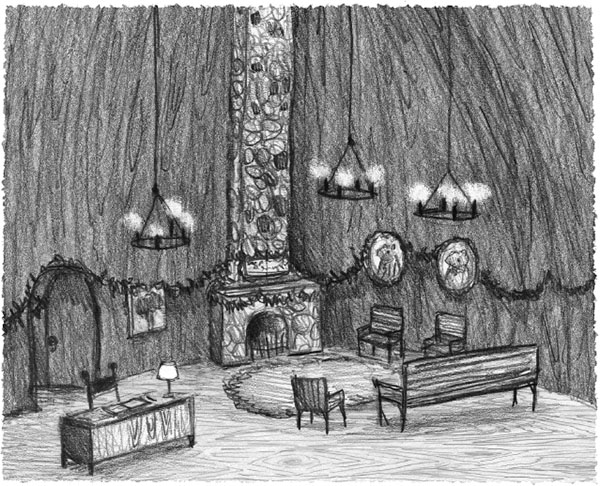 Внутри ствола оказался просторный зал (а для мышки – даже очень просторный!): здесь могла уместиться компания небольших зверушек. Напротив двери располагался каменный очаг, он не горел, но был украшен гирляндой из разноцветных листьев. Перед ним был расстелен коврик из мха, а вокруг стояли диваны и кресла из прутиков, обитых всё тем же мхом. Слева располагалась длинная деревянная стойка, на ней лежала большая книга и карандаш из веточки. А с потолка свисали подсвечники-кольца со свечами, которые давали мягкий золотистый свет.