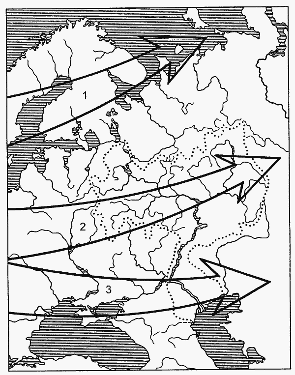 Местоположение циклонического центра действия атмосферы в Европе: 1 – северное; 2 – среднее; 3 – южное.