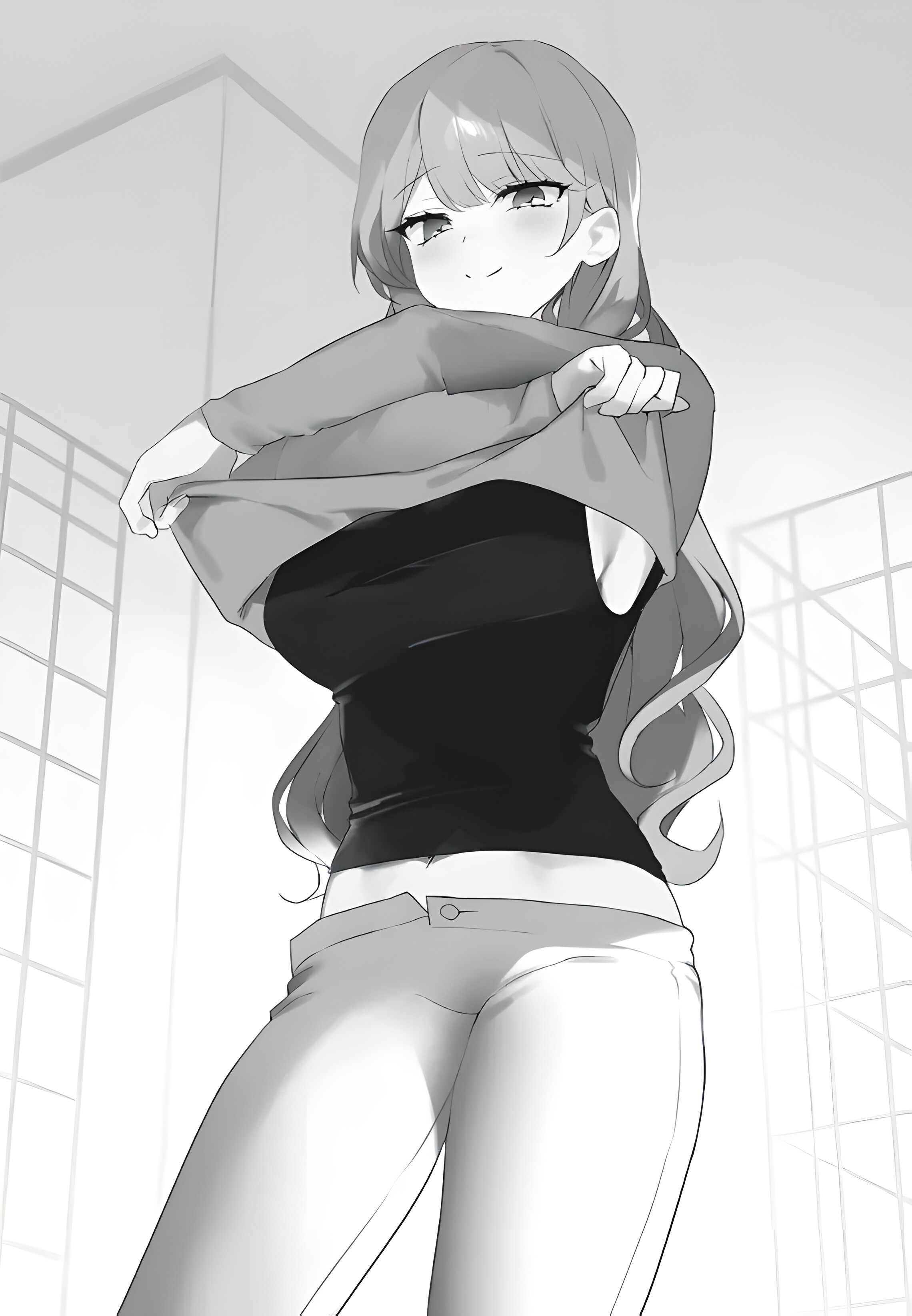 Казалось, на ней была рубашка, поэтому она начала расстегивать ее с передней пуговицы, что означало, что ее нижнее белье не было видно, но её обширное декольте определенно было видно.