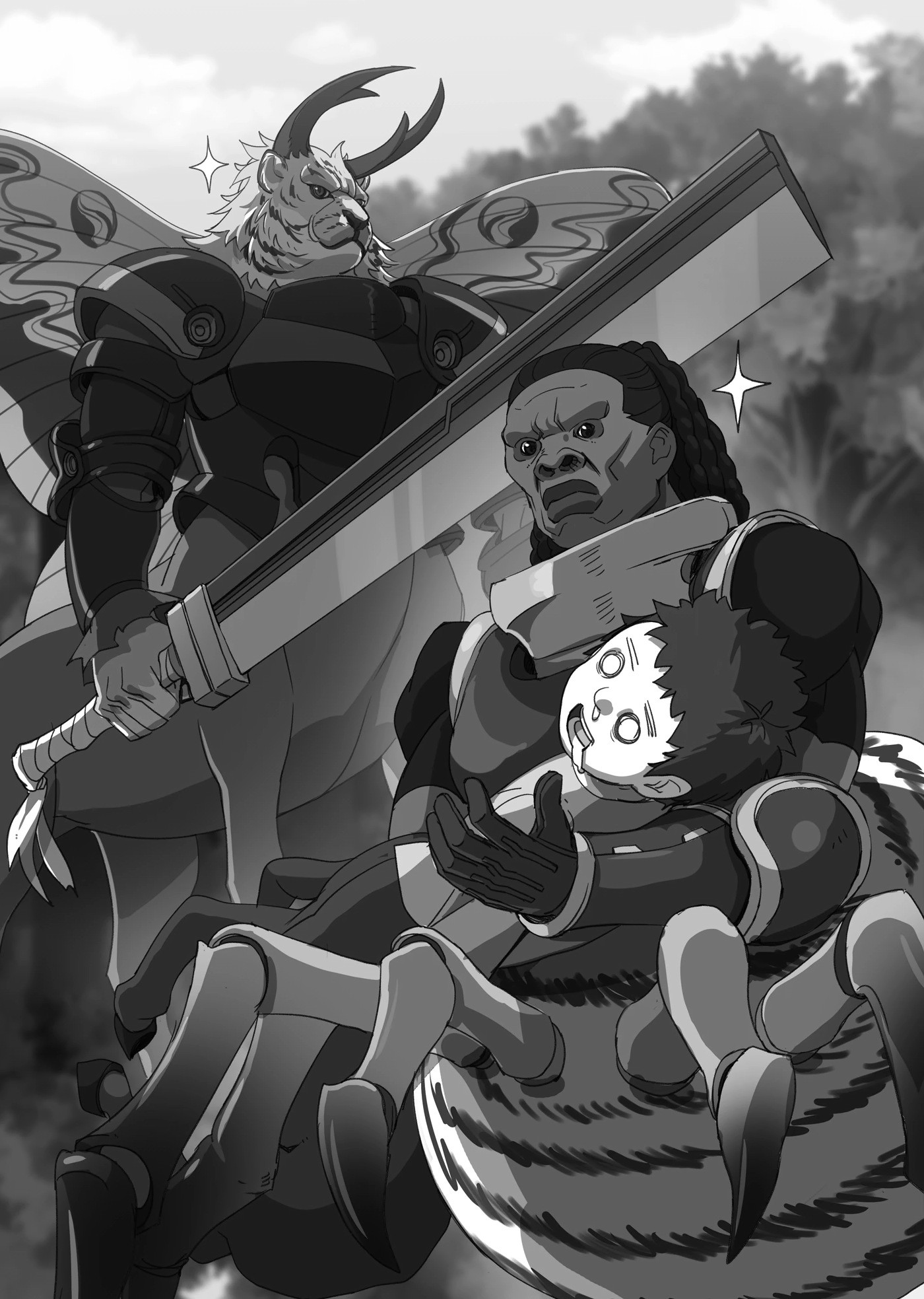 Столкнувшись с Фридрихом и женщиной-рыцарем, дриада с отчаянным выражением лица убегала. Хотя она и могла победить их в бою, но устрашающий вид лишил её желания сражаться. Более того, ей постоянно прилетает в спину заклинания. Размышляя о том, кто это мог быть, она заметила чудовищного человекоподобного кузнечика, зачем-то использующего магию. Увидев это, дриада чуть не расплакалась.