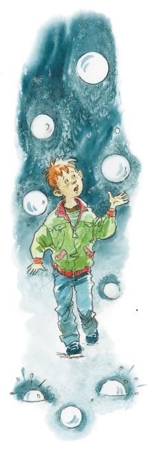 В здании, похожем на консервную банку, оказалась дверь. Толик отворил её и очутился в просторном помещении. Это было очень странное помещение. Откуда-то сверху, с невидимого потолка один за другим медленно опускались голубые шары. У самого пола они вспыхивали голубым светом и гасли, как будто проваливались. Один за одним, один за одним плыли они сверху вниз и лопались, освещая всё вокруг мерцающим светом.