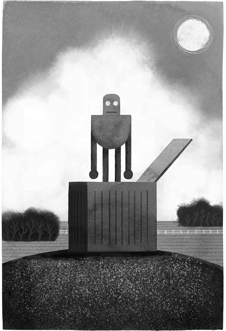 Он сильно хромал и поэтому медленно спустился к ящику, который уже вовсю обнюхивал пёс. Человек открыл защёлку замка и откинул крышку. Затем вынул поролон, размотал все верёвки – и перед ним предстал робот модели ROZZUM 7134. Безжизненное металлическое тело сверкало в лучах вечернего солнца.