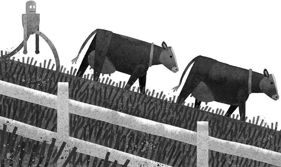 Машина-пастух прежде каталась туда-сюда по лугам, охраняя коров. Но однажды она увязла в грязи, и теперь её облюбовали местные птицы. Универсальный комбайн был величиной с дом на колёсах. Ещё совсем недавно он ездил по полям, сажал, удобрял и собирал кормовые культуры. Но несколько недель назад он застыл на месте и теперь пылился в дальнем конце участка. Дрон – маленький летательный аппарат – раньше парил над фермой и показывал, что и где происходит. Однако стая ворон атаковала его и сбила на землю. Другие неисправные машины уже успели зарасти травой. Да и те, что стояли в сарае, тоже требовали ремонта.