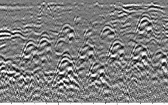 На экране ноутбука появилось горизонтальное сечение изображений, отсканированных Нейтом нынешним утром и представленных в системе трехмерной сейсмики. Каждое изображение представляло картину горизонтального сечения почвы на различной глубине в восьмом квадранте. Изображения представляли собой квадратные срезы серой почвы с нанесенными на них черными линиями в форме парабол – казалось, что этот рельеф образовался вследствие ряби, созданной осушающим ветром на поверхности жидкой почвы. Но черные линии представляли твердую субстанцию.