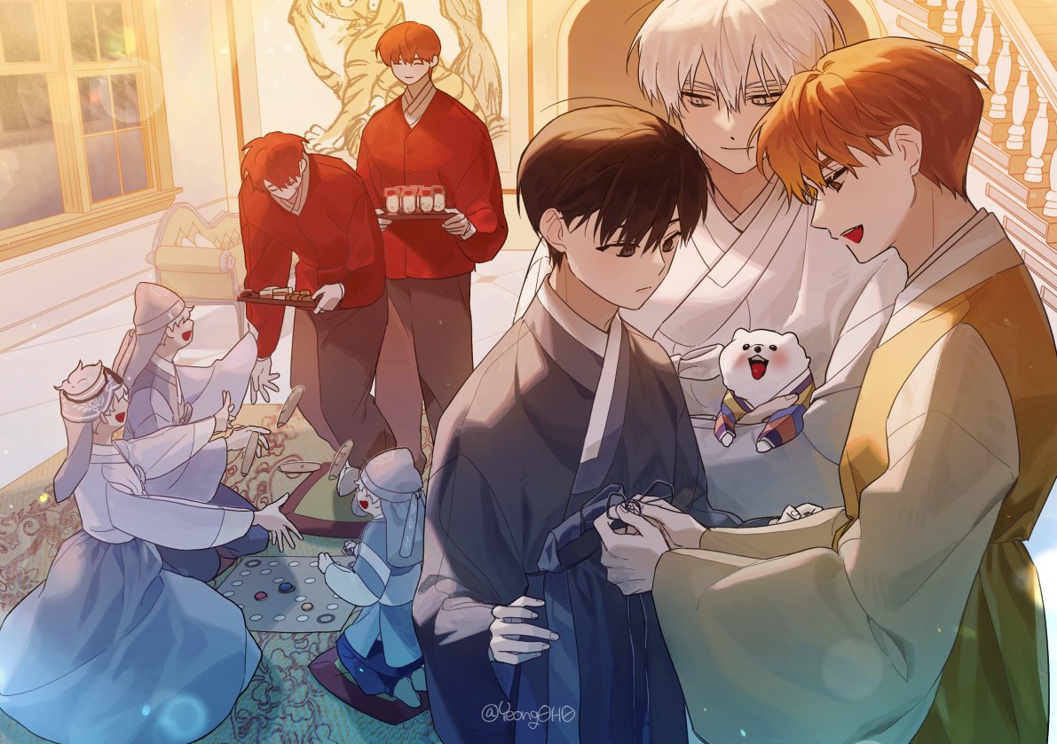 Олма был одет в разноцветное чогори (тип ханбока, который носят дети, с множеством цветов, обычно до 10), поэтому ему было достаточно, чтобы вынести этот обременительный подарок.