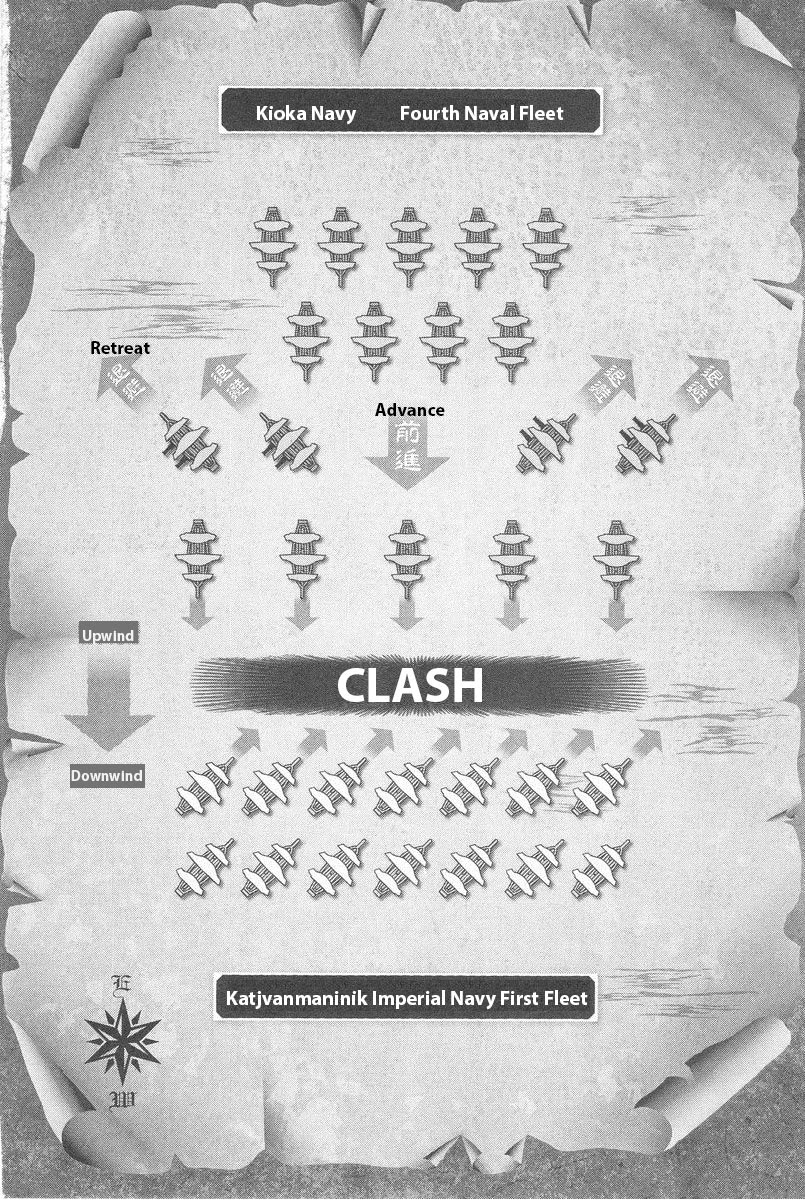 Команда убирает паруса по приказу командующего флотом Хигорума, двигая имперский военный корабль "Копьеносец" под углом к ветру. Их союзники в том же строю одновременно изменили курс, приближаясь к 16 судам Киоки.