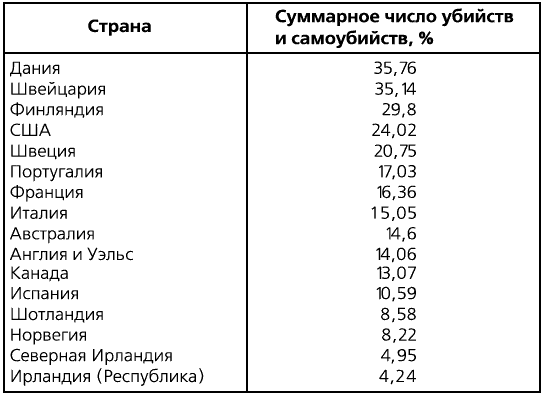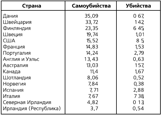 При беглом взгляде на эти таблицы бросается в глаза интересный факт: страны с самым высоким количеством самоубийств – Дания, Швейцария, Финляндия, Швеция и США – имеют и самый высокий общий показатель количества убийств и самоубийств, в то время как другие страны – Испания, Италия, Северная Ирландия и Ирландская Республика – характеризуются самыми низкими показателями и по количеству убийств, и по числу самоубийств.